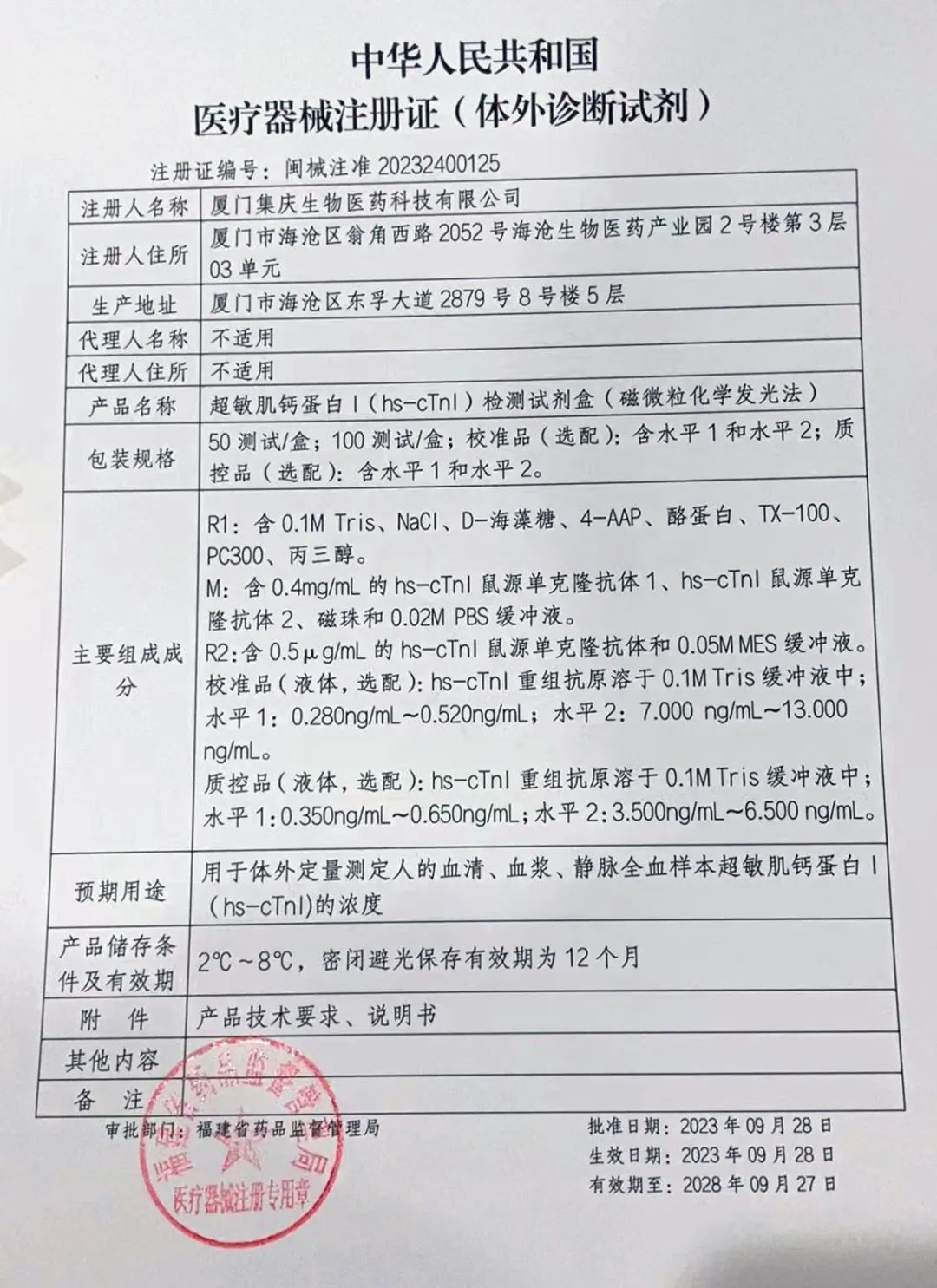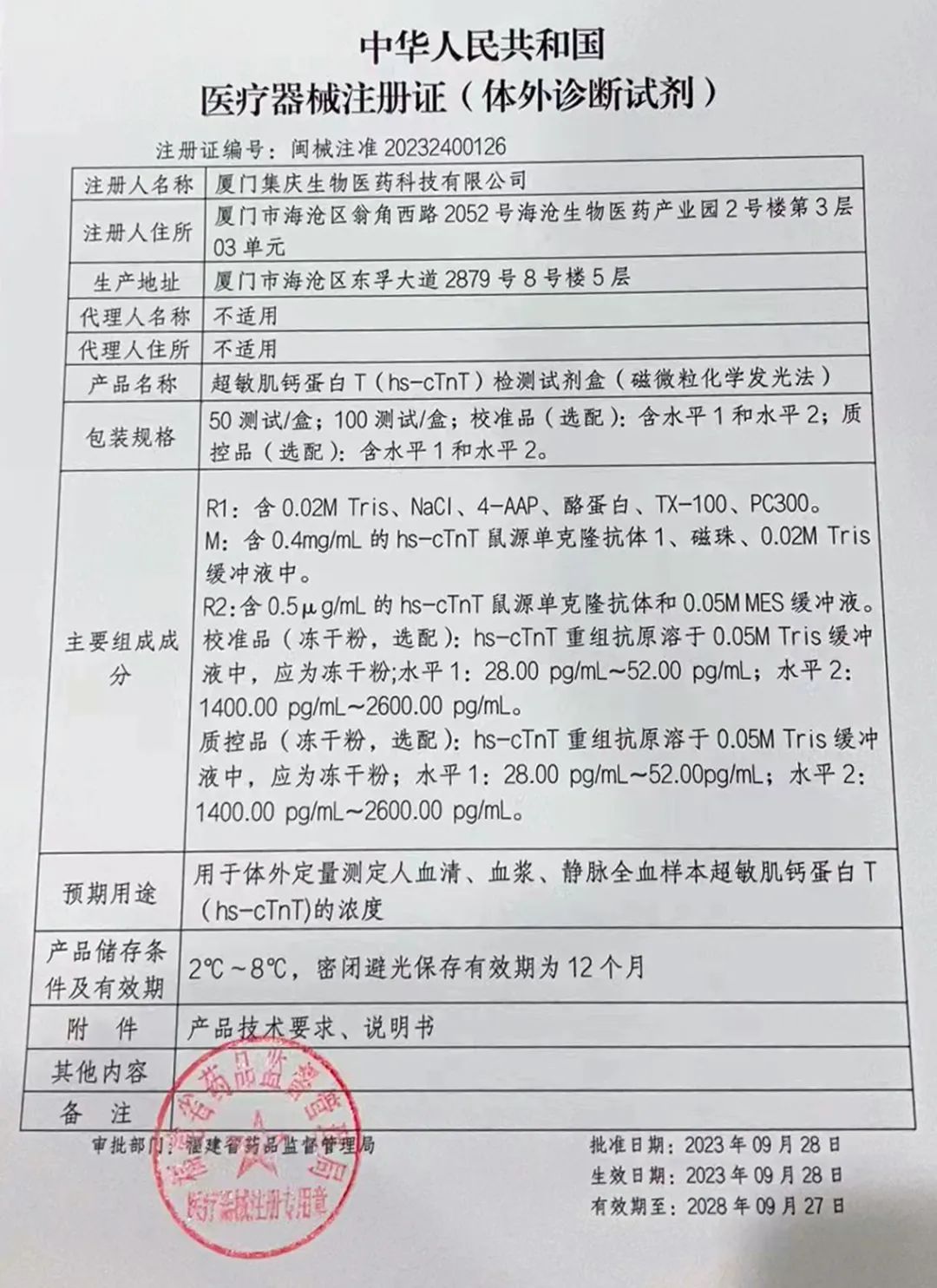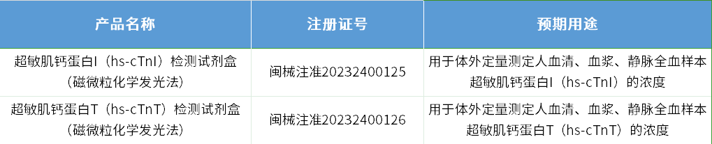 近日,集庆生物自主研发的超敏肌钙蛋白I(hs-cTnI)检测试剂盒(磁微粒化学发光法)、超敏肌钙蛋白T(hs-cTnT)检测试剂盒(磁微粒化学发光法),经福建省药品监督管理局批准获得医疗器械注册证,正式获准投入市场。详细信息如下: